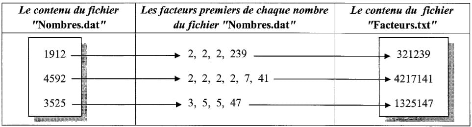 A partir d'un fichier nommé "Nombres.dat" contenant N entiers, formé chacun de P chiffres, on veut former un deuxième fichier nommé "Facteurs.txt" qui contiendra, des chaînes. Chaque chaîne représente la concaténation de la fréquence de chacun des facteurs premiers d'un nombre du fichier "Nombres.dat" suivi du facteur premier lui même.