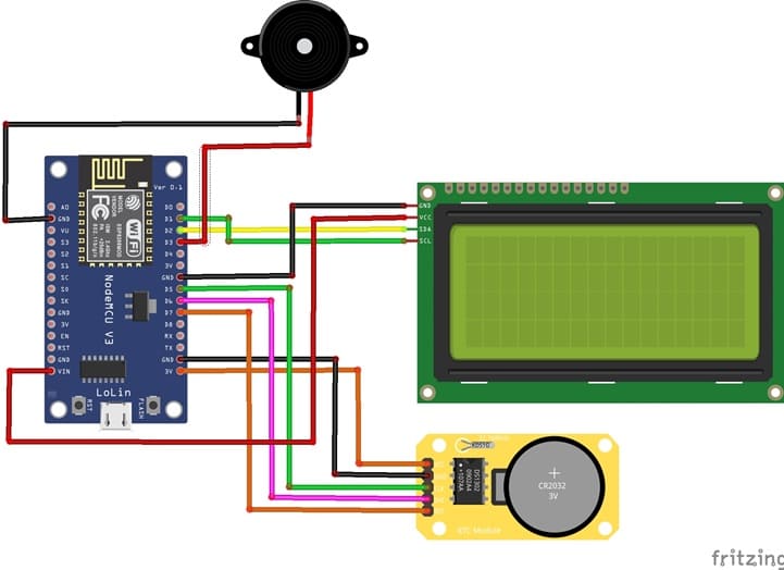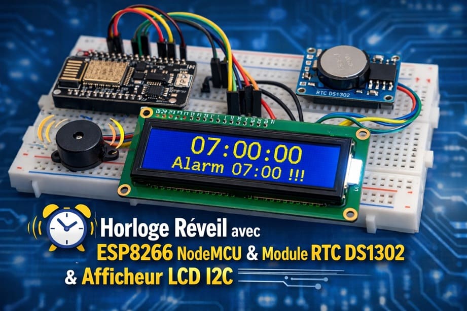 Ce projet est idéal pour apprendre la gestion du temps réel, l’utilisation d’un module RTC, le contrôle d’un afficheur LCD I2C et l’intégration d’un buzzer avec la carte ESP8266 NodeMCU.
