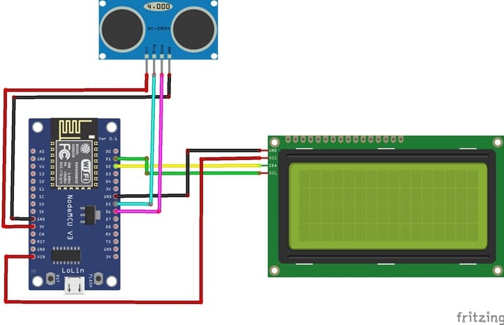 - entre la carte NodeMCU et le capteur HC-SR04,
