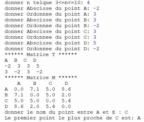 Déclaration des objets Cette fonction a pour rôle de remplir la matrice t avec les coordonnées de n points, saisis par l’utilisateur. La matrice t est organisée comme suit : - t[0][i] contient l’abscisse du point numéro i - t[1][i] contient son ordonnée Les points sont nommés automatiquement A, B, C, ... grâce au code ASCII (A = 65). Ainsi, pour chaque point (A, B, C, …), le programme demande : son abscisse, son ordonnée et stocke ces valeurs dans la matrice. Déclaration des objets Cette procédure sert à afficher la matrice T, qui contient les coordonnées des points. Il montre successivement : - les noms des points (A, B, C, …) - la ligne des abscisses (t[0][i]) - la ligne des ordonnées (t[1][i]) L’affichage se fait sous forme d’un tableau lisible. Déclaration des objets Cette fonction calcule et renvoie la distance euclidienne entre deux points du plan. Les points ont pour coordonnées : point 1 : (x1, y1) et point 2 : (x2, y2) Cette procédure sert à afficher la matrice M, qui contient les distances entre tous les points. 1- Elle affiche les noms des points (A, B, C, …) sur la première ligne. 2- Pour chaque point (ligne) : elle affiche d’abord son nom (A, B, C, …), puis toutes les distances entre ce point et les autres (m[i][j]). Déclaration des objets Cette procédure sert à afficher la matrice M, qui contient les distances entre tous les points. 1- Elle affiche les noms des points (A, B, C, …) sur la première ligne. 2- Pour chaque point (ligne) : elle affiche d’abord son nom (A, B, C, …), puis toutes les distances entre ce point et les autres (m[i][j]). Déclaration des objets Ce programme sert à saisir un point valide, c’est-à-dire une lettre représentant un point parmi : A, B, C, … Déclaration des objets Cette fonction recherche et retourne le nom du point le plus proche d’un point donné, en comparant les distances contenues dans la matrice M. Déclaration des objets Exécution du programme