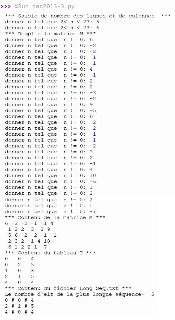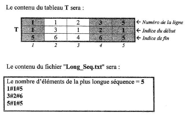 Ecrire un programme en Python intitulé Sequence qui permet, à partir d'une matrice M de dimension LxC, de remplir un tableau T et de créer un fichier "Long_Seq.txt", comme décrit précédemment.