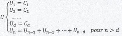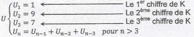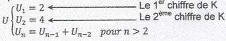 Soit K un entier de d chiffres (avec d >= 2) ayant la forme C1C2 … Cd. A partir de ce nombre on définit une suite U telle que les d premiers termes sont les d chiffres du nombre K. Ensuite chaque terme suivant est calculé en additionnant les d termes précédents.