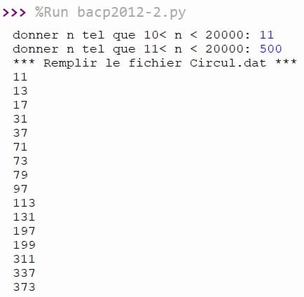 de chercher tous les nombres premiers circulaires se trouvant dans un intervalle [p,ce (avec p et q sont deux entiers donnés tels que 10 < p < q < 20000) et les sauvegarder dans un fichier intitulé "Circul.dat".
