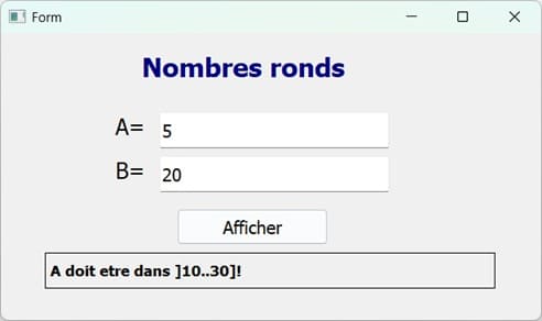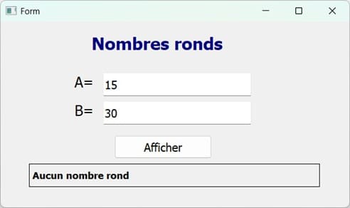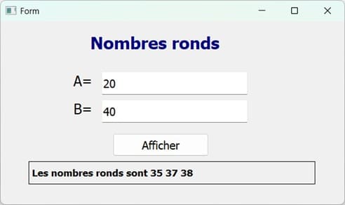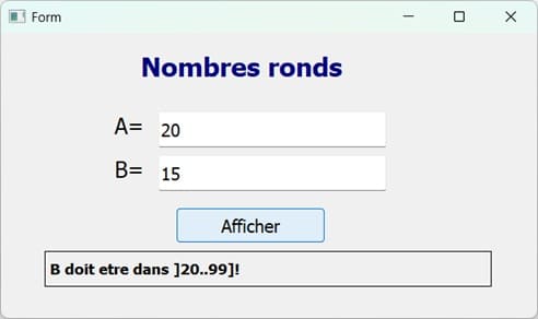 On se propose de concevoir une interface graphique permettant de saisir deux entiers A et B tels que (10 ≤ A ≤ 30) et (A < B ≤ 99), puis d’afficher tous les nombres ronds compris entre A et B.