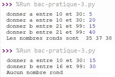 Algorithme nombres_ronds Debut a <- saisir('a',10,30) b <- saisir('b',a+1,99) ronds(a,b) Fin |