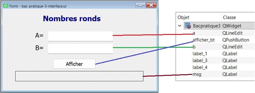 Pour créer une application en Python et Designer QT afin de saisir deux entiers A et B tels que (10 ≤ A ≤ 30) et (A < B ≤ 99), puis d’afficher tous les nombres ronds compris entre A et B., on va suivre ces étapes:
