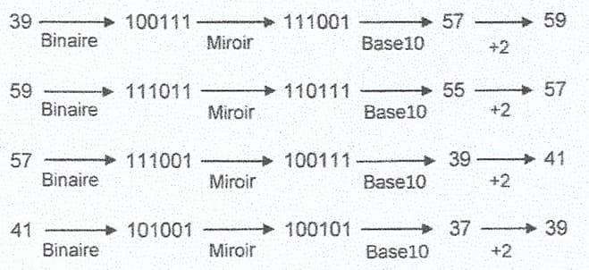 Répéter les trois étapes précédentes jusqu'à ce que l'intensité de l'impulsion émise devienne périodique c'est-à-dire que le résultat retourné par l'étape 3 soit l'entier de départ.