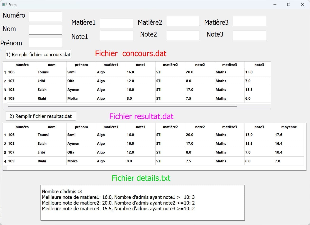 Le premier, intitulé resultat.dat contient n enregistrements comportant en plus des données précédentes, d'autres champs "moycnne" et "rang" de types respectifs réel et entier. Les enregistrements de ce fichier sont classés par ordre de mérite c'est- à-dire suivant un tri décroissant sur tes moyennes.