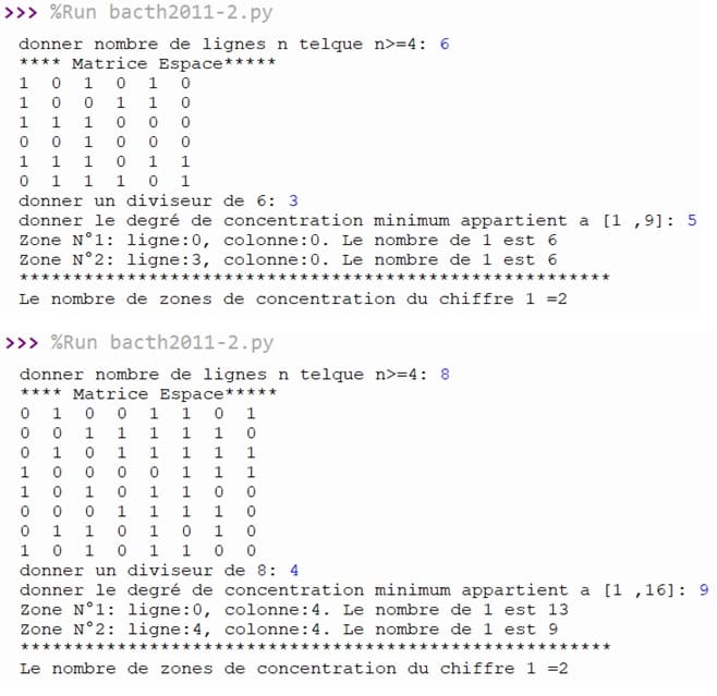 Soit Espace une matrice carrée d'ordre N remplie par des 0 et des 1. On se propose de Chercher les zones de concentration du chiffre 1 qui peuvent exister dans la matrice Espace. Pour déterminer les zones de concentration, on suit les étapes suivantes :