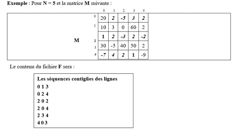 A partir d’une matrice M remplie aléatoirement, on se propose de remplir un fichier texte F par les positions des séquences contigües, se trouvant dans les lignes de cette matrice, comme suit :