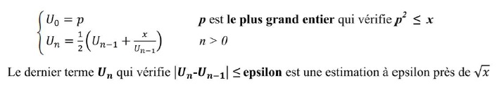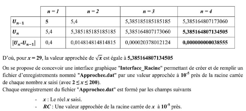 - d'ajouter dans le fichier "Approchee.dat" le nombre x saisi ainsi que la valeur approchée de sa racine carrée, à 10-5 près, dans le cas contraire.