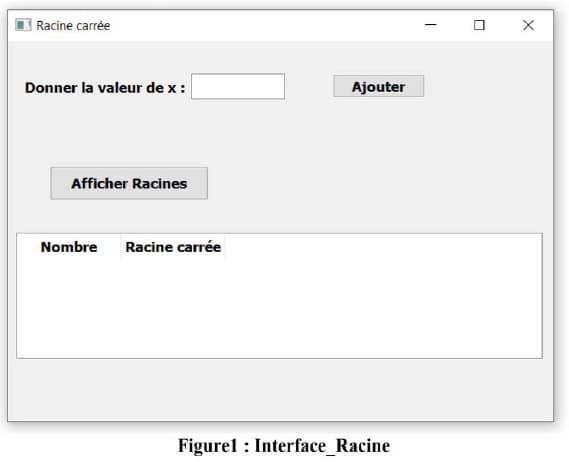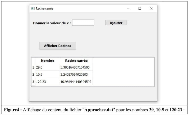 - Une table widget contenant deux colonnes "Nombre" et "Racine carrée" pour afficher le contenu du fichier "Approchee.dat".