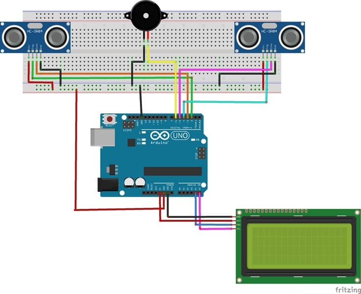 Enfin, un buzzer est intégré au système pour fournir un signal sonore. Il peut être utilisé pour alerter lorsque la vitesse dépasse une certaine limite définie dans le programme. Cela rend le projet plus interactif et proche d’un véritable radar de contrôle de vitesse utilisé dans la vie réelle.