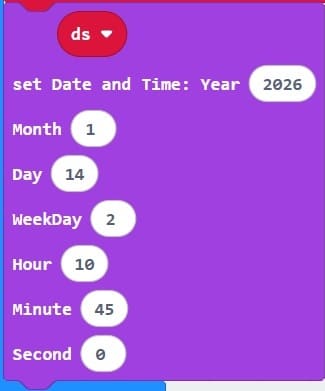 Ce programme MakeCode permet de lire l’heure et la date depuis le module RTC DS1302 et de les afficher sur un écran LCD I2C. Il inclut également une fonction réveil qui déclenche un buzzer et un message sur l’écran à une heure programmée (ici 7:00).