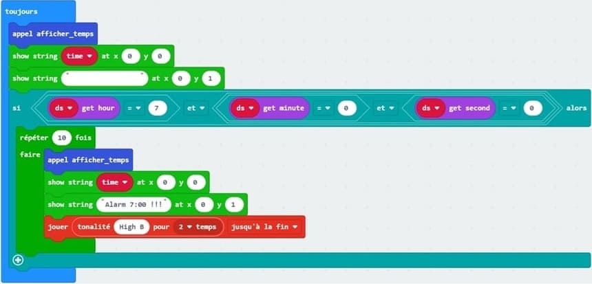 Lorsque l’heure correspond à 7:00:00, la Micro:bit déclenche le réveil :