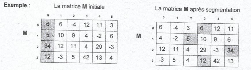Soit une matrice M de nl * nc entiers, la segmentation d'une ligne i de la matrice M par rapport à l'élément e de la première colonne de cette ligne (e = M[i,0]) consiste à placer à gauche de l'élément e tous les éléments qui lui sont inférieurs ou égaux et à sa droite tous les éléments qui lui sont strictement supérieurs.