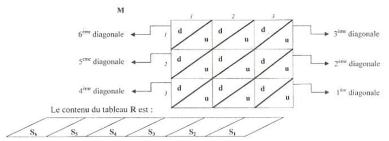 d) La matrice M est supposée formée par 2xri diagonales en plaçant le chiffre des dizaines dans la moitié supérieure Lie chaque case et le chiffre des unités dans b moitié inférieure de la même case, comme le montre la figure ci-après pour le cas où n=3.