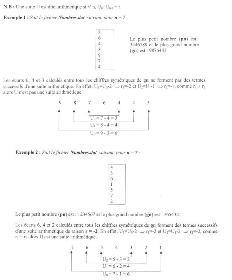 Algorithme suite_aritmetique Debut n <- saisie() # Saisie du nombre de chiffres remplir_fichier_nombres(n) # Remplir le fichier avec n chiffres aléatoires extraction_nombre(t, n) # Charger ces chiffres dans le tableau t Ecrire(max_nombre(t, n)) # Afficher le premier maximum (non utilisé ensuite) pn <- min_nombre(t, n) # Calcul du plus petit nombre Ecrire('Le plus petit nombre= ' + str(pn)) gn <- max_nombre(t, n) # Calcul du plus grand nombre Ecrire('Le plus grand nombre= ' + gn) # Vérification si les chiffres du plus grand nombre forment une suite arithmétique Si verif_suite_arithmetique(t, n) alors ecrire('Les chiffres de ' + gn + ' forme une suite arithmetique') Sinon Ecrire('Les chiffres de ' + gn + ' ne forme pas une suite arithmetique') Finsi Fin |