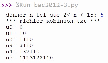 Ecrire un programme Python et l'enregistrer sous le nom Robinson, permettant de remplir et d'afficher un fichier texte nomme "Robinson.txt" contenant les k premiers termes de la suite de Robinson (avec 2 < k < 15) sachant que chaque terme de la suite occupera une ligne dans le fichier "Robinson.txt".