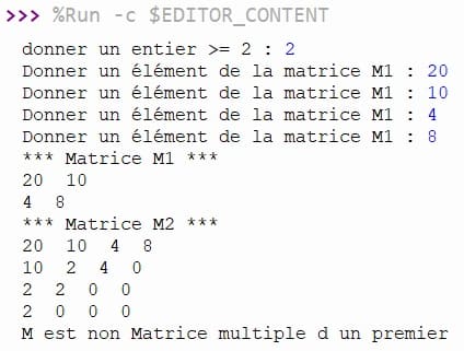 Le PGCD des éléments de Mi est égal â M2[3,0] qui est égal à 2. Comme 2 est un nombre premier, donc Mi est dite Matrice multiple d'un premier.