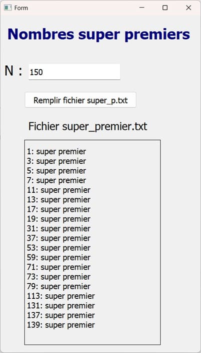 - saisir un entier n tel que 40000 < n < 100000, - chercher tous les nombres premiers inférieurs ou égaux à n, les afficher à raison d'un nombre par ligne en mentionnant devant chaque nombre super premier la note « super premier » et de faire la même chose dans un fichier texte intitulé super_p.txt.