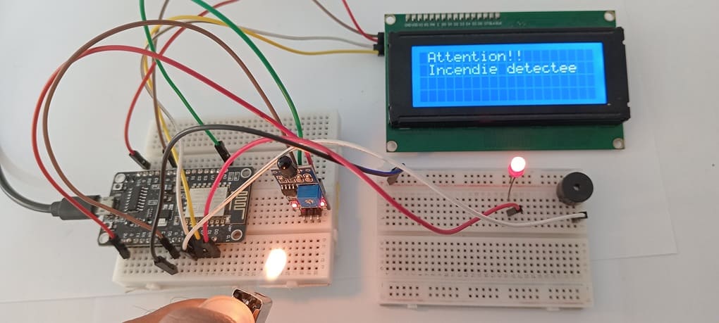 - affiche un message d’alerte sur l’écran LCD I2C (par exemple : “🔥 Flamme détectée !”).