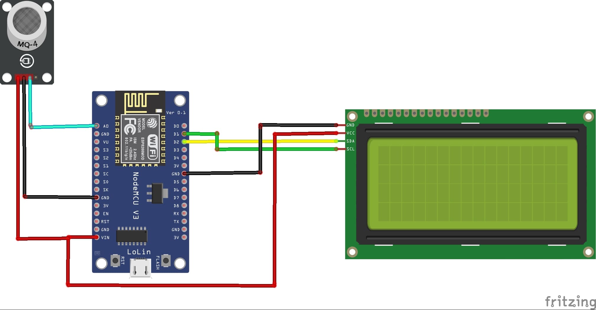 - Connecter la broche GND(-) du capteur MQ-4 à la broche GND de la carte ESP8266